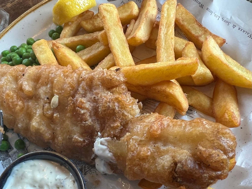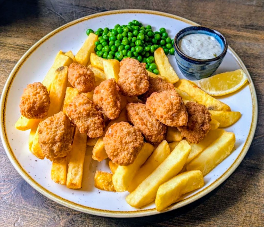 Brakspear beer battered haddock and chips with peas and tartare sauce £17.50Breaded scampi and chips with peas and tartare sauce £17.50