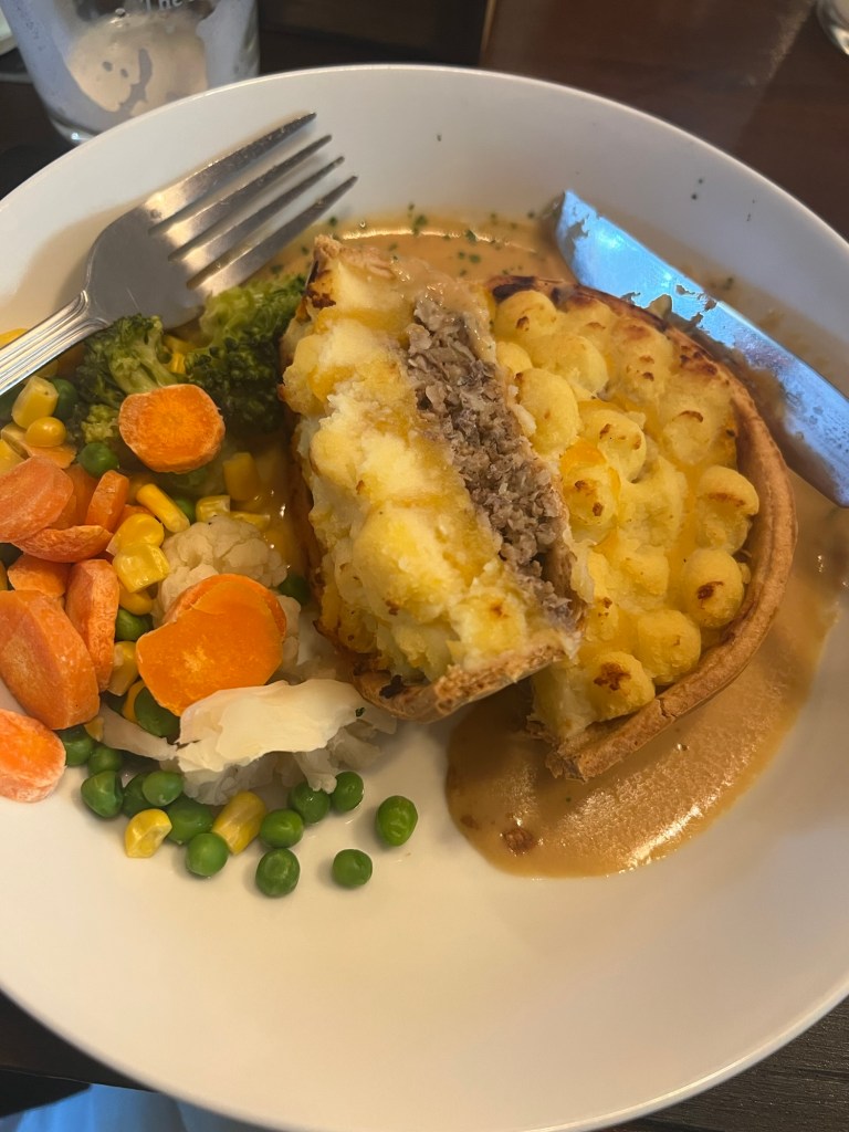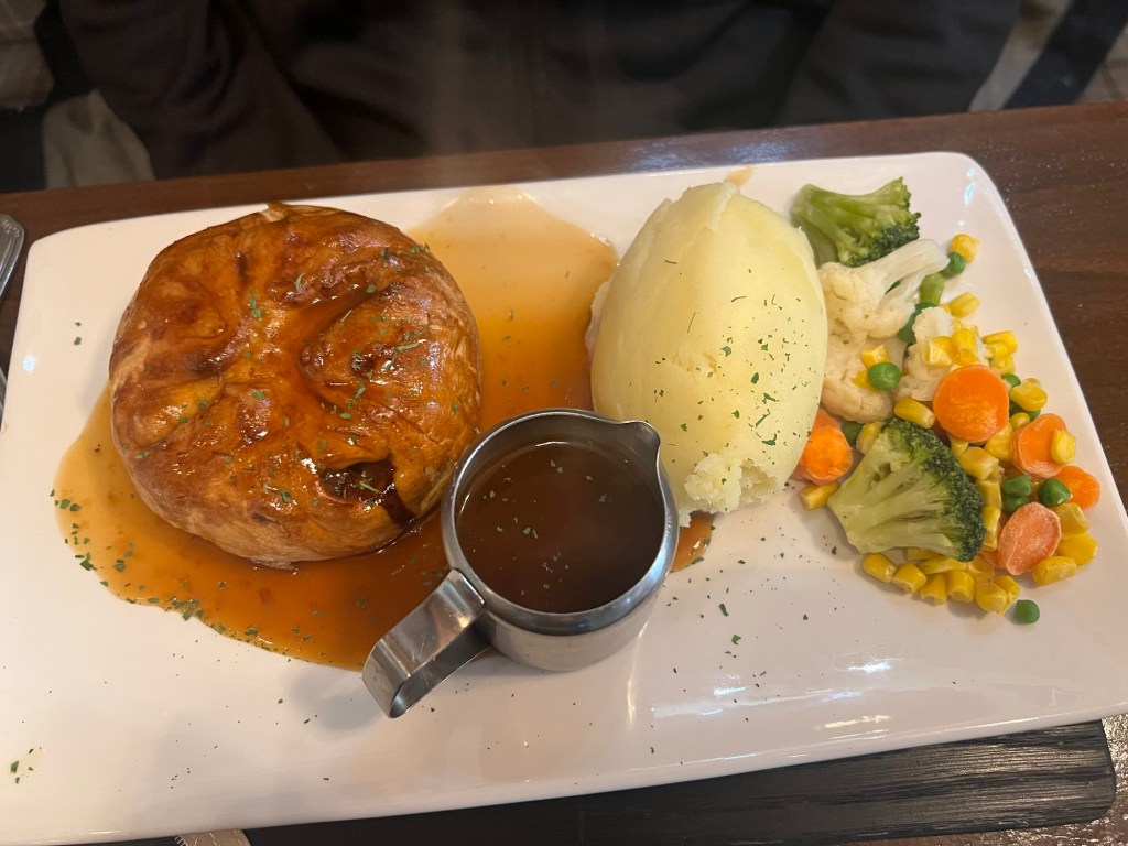 Freshly made pie served with seasonal veg, mash or chunky chips