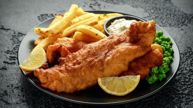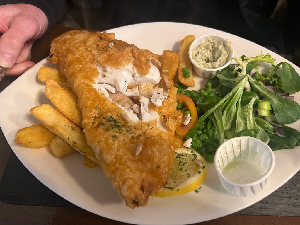 Crisp battered fish with mushy peas, chunky chips and tartare sauce £17.95