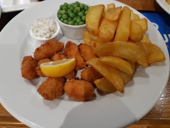 Whitby wholetail scampi, chunky chips. garden peas & tartare sauce £17.95