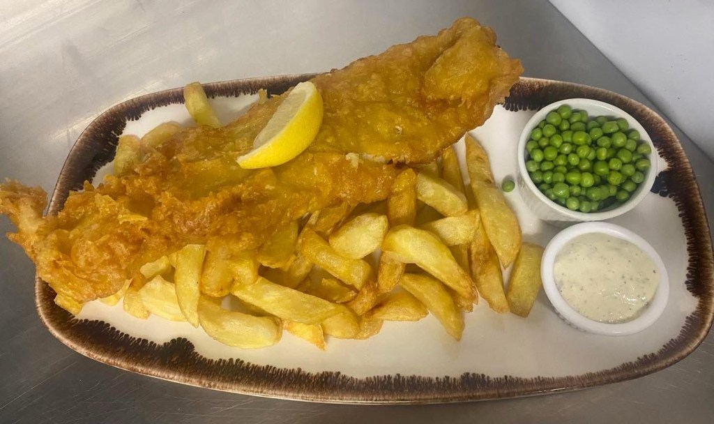 Battered served with triple-cooked chips, tartare sauce and mushy or garden peas.