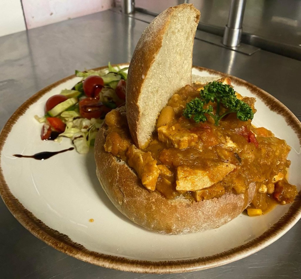 Often referred to simply as a bunny, this South-African fast-food dish consists of a hollowed-out soup roll filled with a Cape Malay Curry. It originated among Indian South Africans of Durban. Served with tomato sambals.