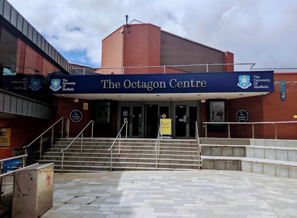 The Octagon Centre, built in 1983, is a multi-purpose conference centre and music venue at the University of Sheffield, England. Situated in the Western Bank campus, it is joined by a skyway to University House and comprises an eight-sided auditorium with a capacity of 1,800 (1,230 seated), offices, meeting rooms, and a lounge with bar and patio.